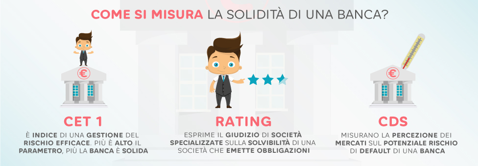 Esistono diversi parametri per valutare la solidità delle banche: i più importanti da prendere in considerazione sono il rapporto patrimoniale CET1 (Common Equity Tier 1 CET 1), il rating delle agenzie specializzate e il valore dei CDS (Credit Default Swap).